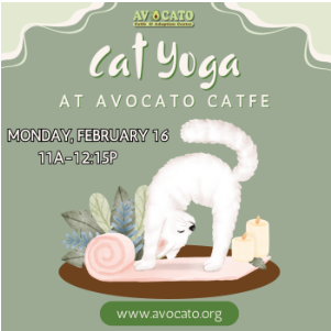 🧘♀️🐾 CAT YOGA AT AVOCATO CATFÉ! 🐾🧘♂️ Monday, 2/16 • 11:00a–12:15p Join the catfé kitties for a 75-minute yoga class full of gentle movement, guided flow, and plenty of kitty cuddles. Leave your troubles at the door, roll out your mat, and enjoy over an hour of uninterrupted bliss surrounded by purrs and whiskers 💛...