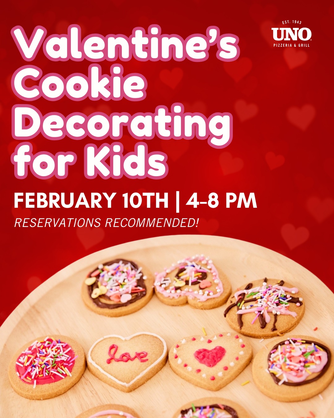 Valentine’s Cookie Decorating for Kids!Let your little ones get creative with a sweet, hands-on Valentine’s Cookie Decorating Event at UNO! Lots of sprinkles, lots of smiles, and plenty of Valentine’s fun. Perfect for little bakers and big smiles. Reservations are recommended, call your local UNO.